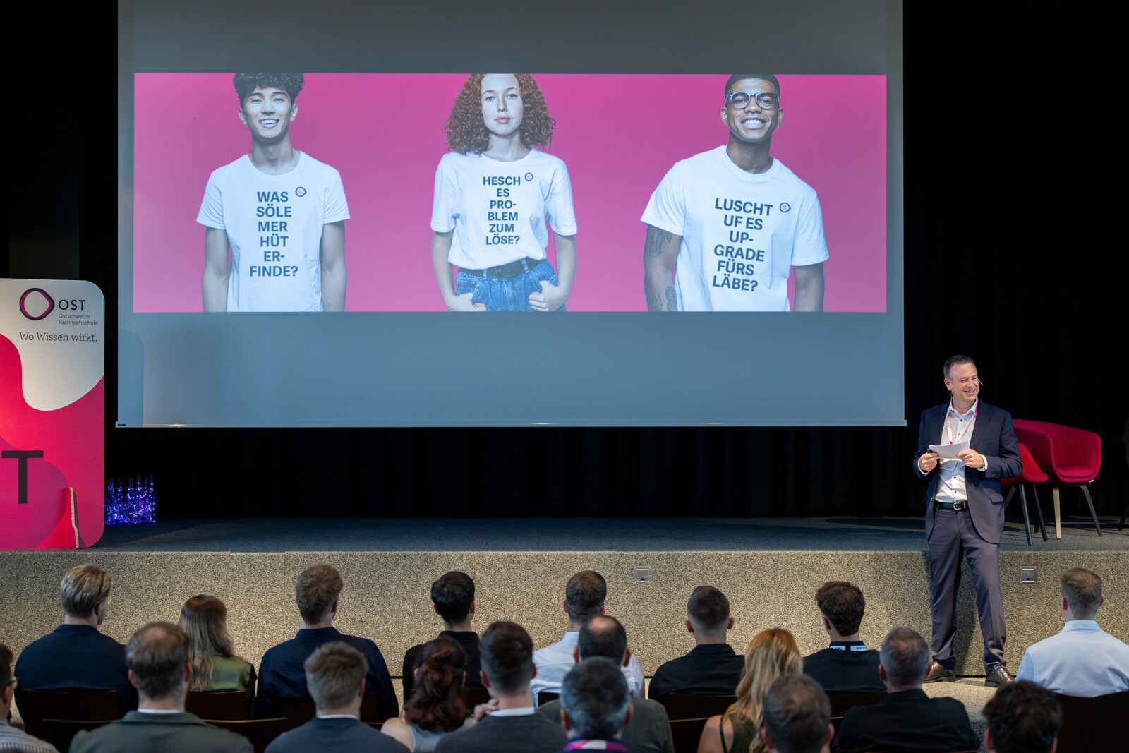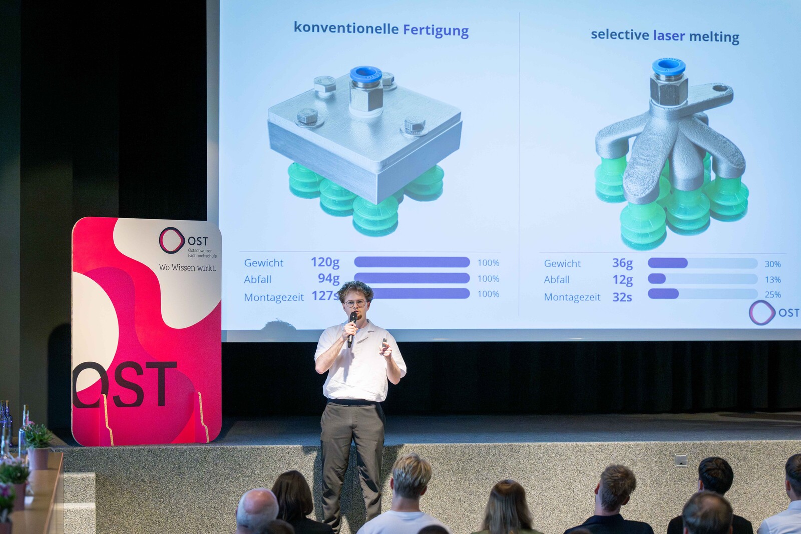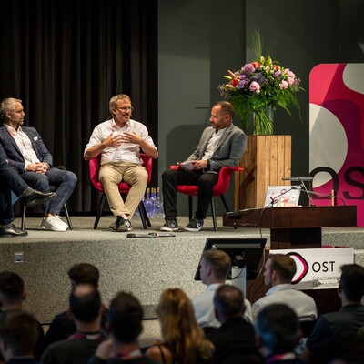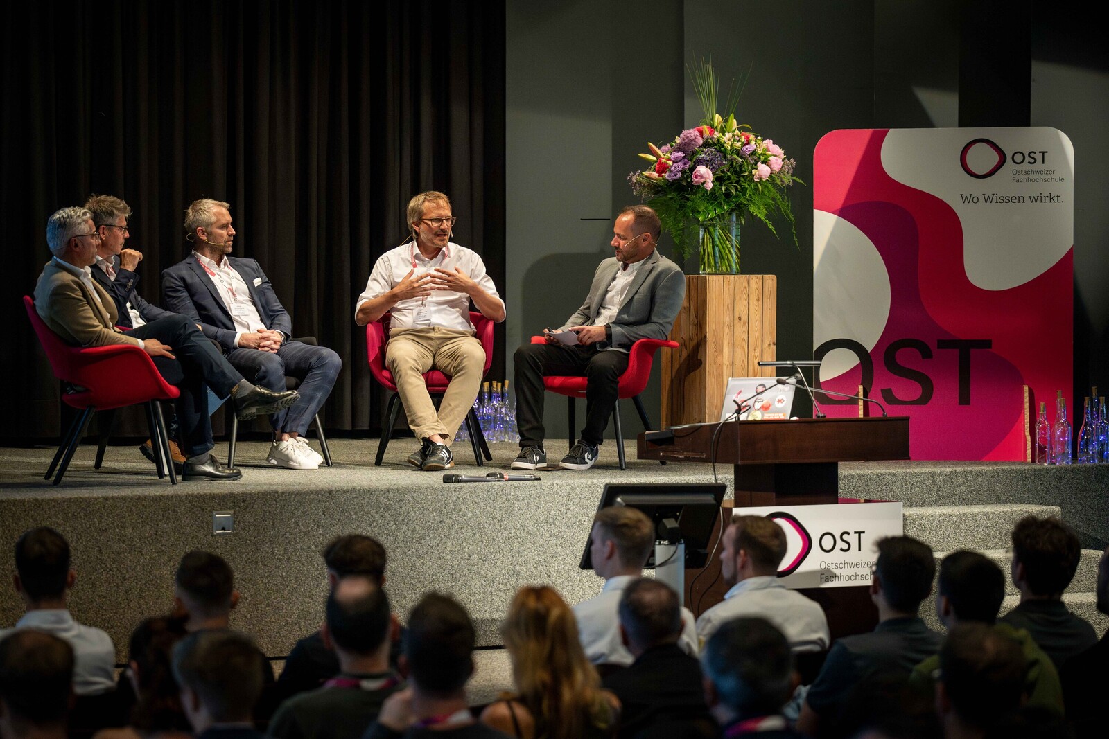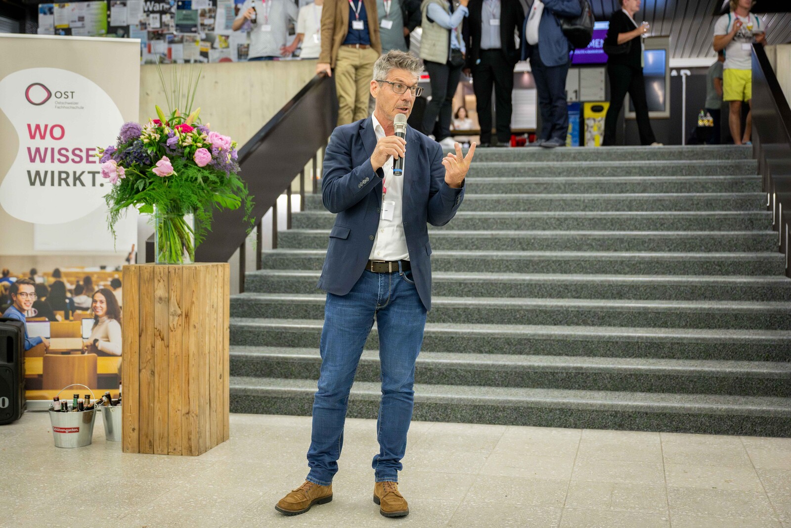 Andreas Wälti, CEO des Technologieunternehmens Evatec, richtete ein Grusswort an die angehenden Wirtschaftsingenieurinnen und -ingenieure. In einer Podiumsdiskussion sprachen Vertreter aus Wirtschaft und Industrie über den Mehrwert für Unternehmen, wenn sie mit der OST zusammenarbeiten.
