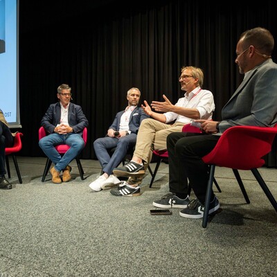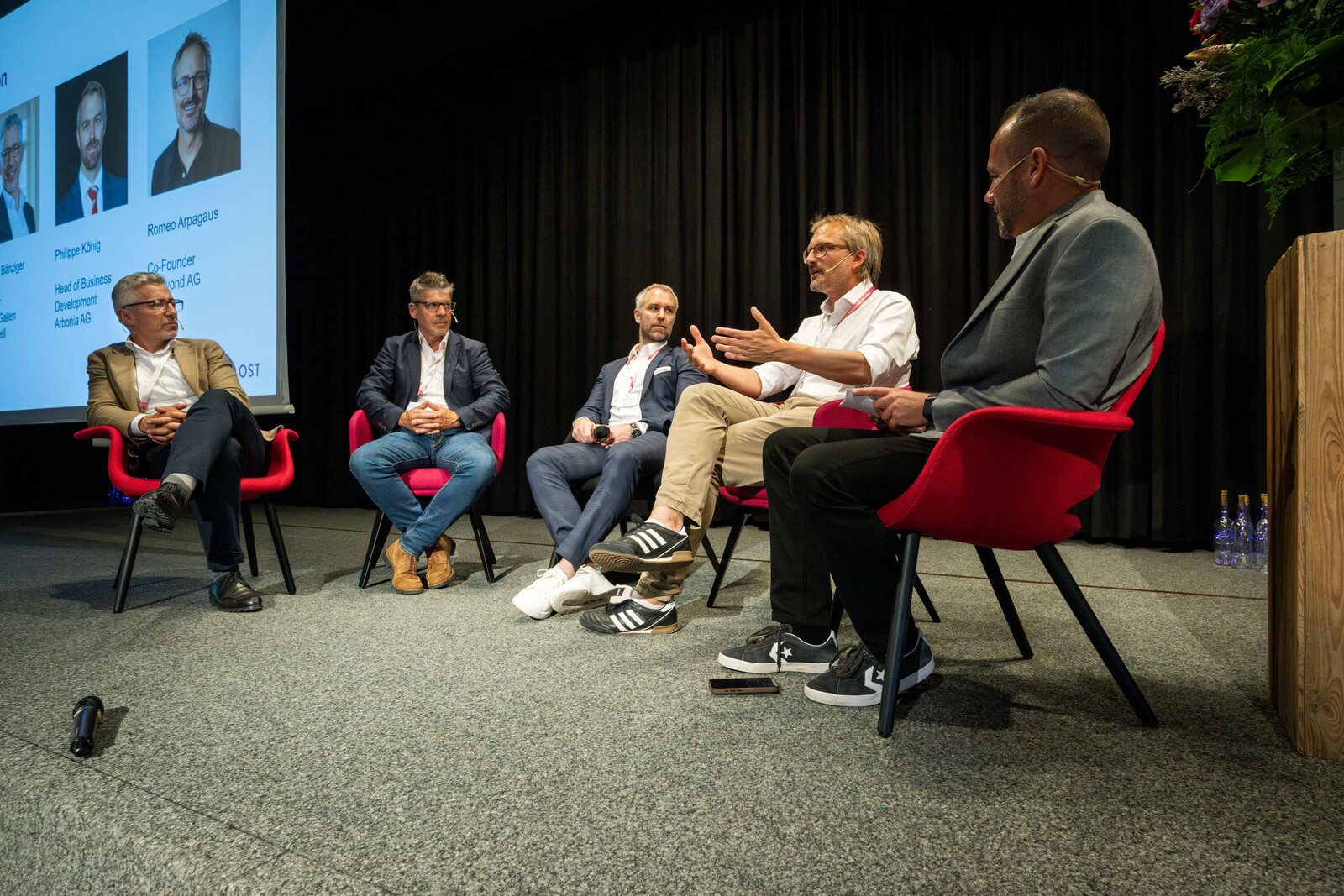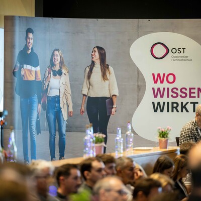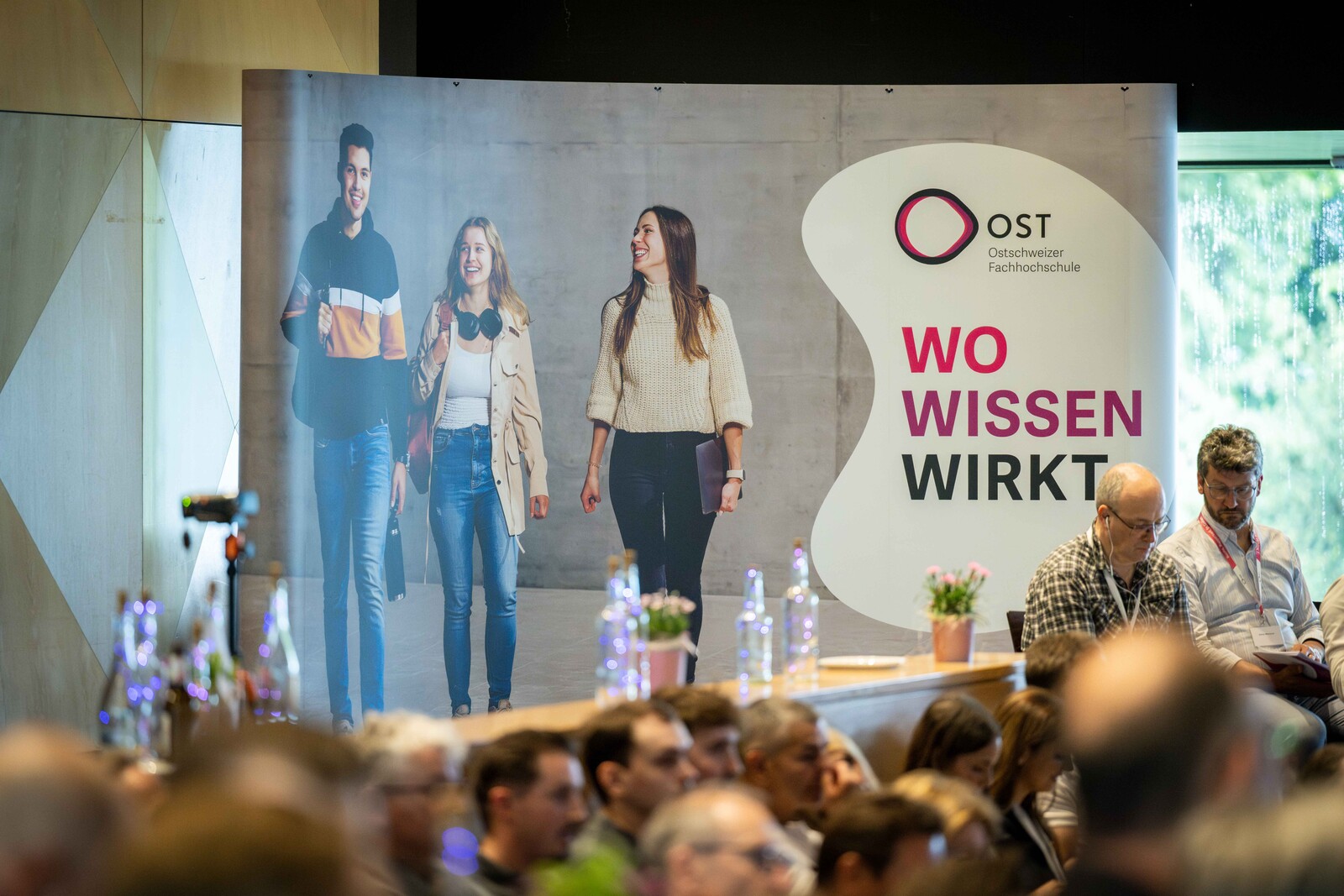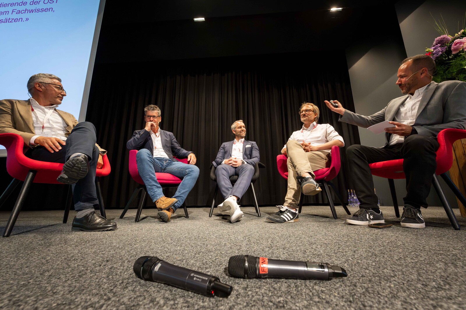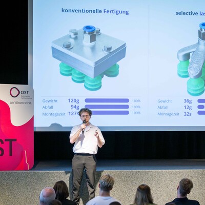 Andreas Wälti, CEO des Technologieunternehmens Evatec, richtete ein Grusswort an die angehenden Wirtschaftsingenieurinnen und -ingenieure. In einer Podiumsdiskussion sprachen Vertreter aus Wirtschaft und Industrie über den Mehrwert für Unternehmen, wenn sie mit der OST zusammenarbeiten.