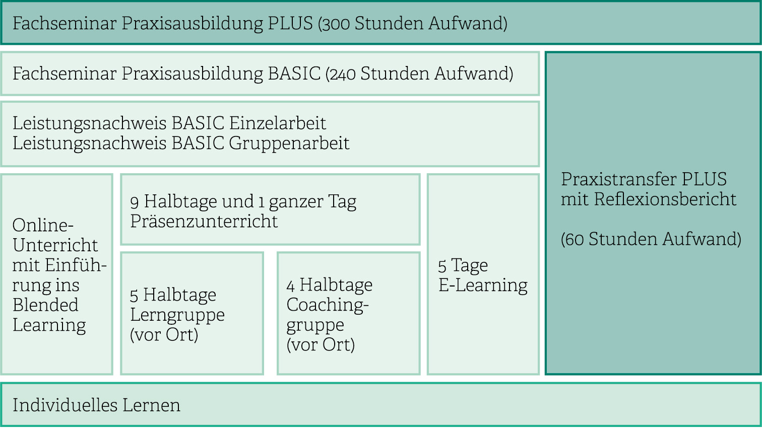 Das Fachseminar Praxisausbildung PLUS umfasst zusätzlich zum Seminar BASIC einen Praxistransfer, bei das Gelernte praktisch angewandt und in einer schriftlichen Arbeit mit 60 Std. Workload reflektiert und mit den Seminarinhalten verknüpft wird.