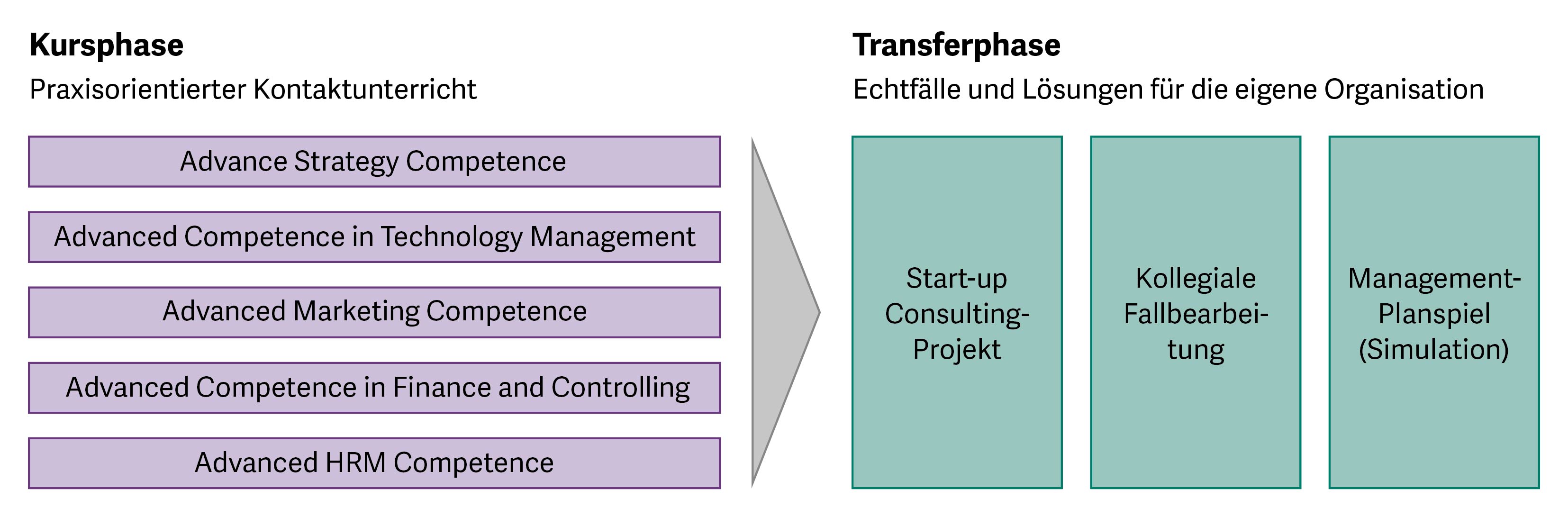 Der Zertifikatskurs integriert alle relevanten Managementfelder und setzt sich aus einer Kursphase mit praxisorientiertem Kontaktunterricht und einer Transferphase zusammen, in der Sie das erworbene Wissen anwenden, um echte betriebswirtschaftliche Problemstellungen zu lösen.
