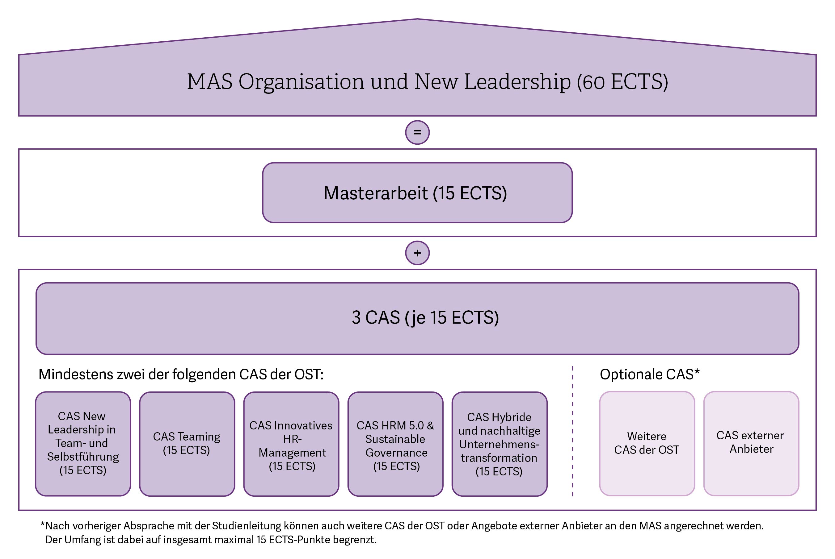 Nach vorheriger Absprache mit der Studienleitung können auch weitere CAS der OST oder Angebote externer Anbieter an den MAS angerechnet werden. Der Umfang ist dabei auf insgesamt maximal 15 ECTS-Punkte begrenzt.