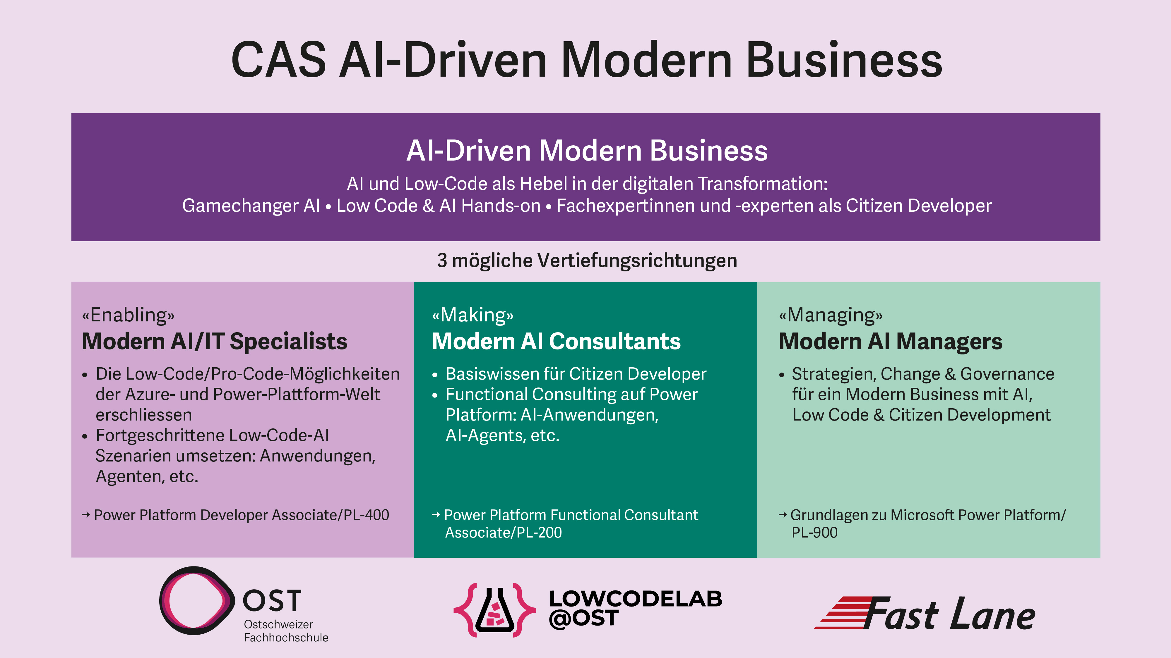 Für eine strategische, wirksame und sichere Nutzung des Microsoft-Ökosystems fehlt allerdings oft das entsprechende Grundlagenwissen. Der CAS AI-Driven Modern Business verbindet die Themen AI sowie Low und No Code miteinander, beleuchtet eine AI- und Low-Code-getriebene Digitalisierung am Beispiel des Microsoft-Ökosystems und ermöglicht Vertiefungen für die IT-, die Business- und die Managementperspektive.
