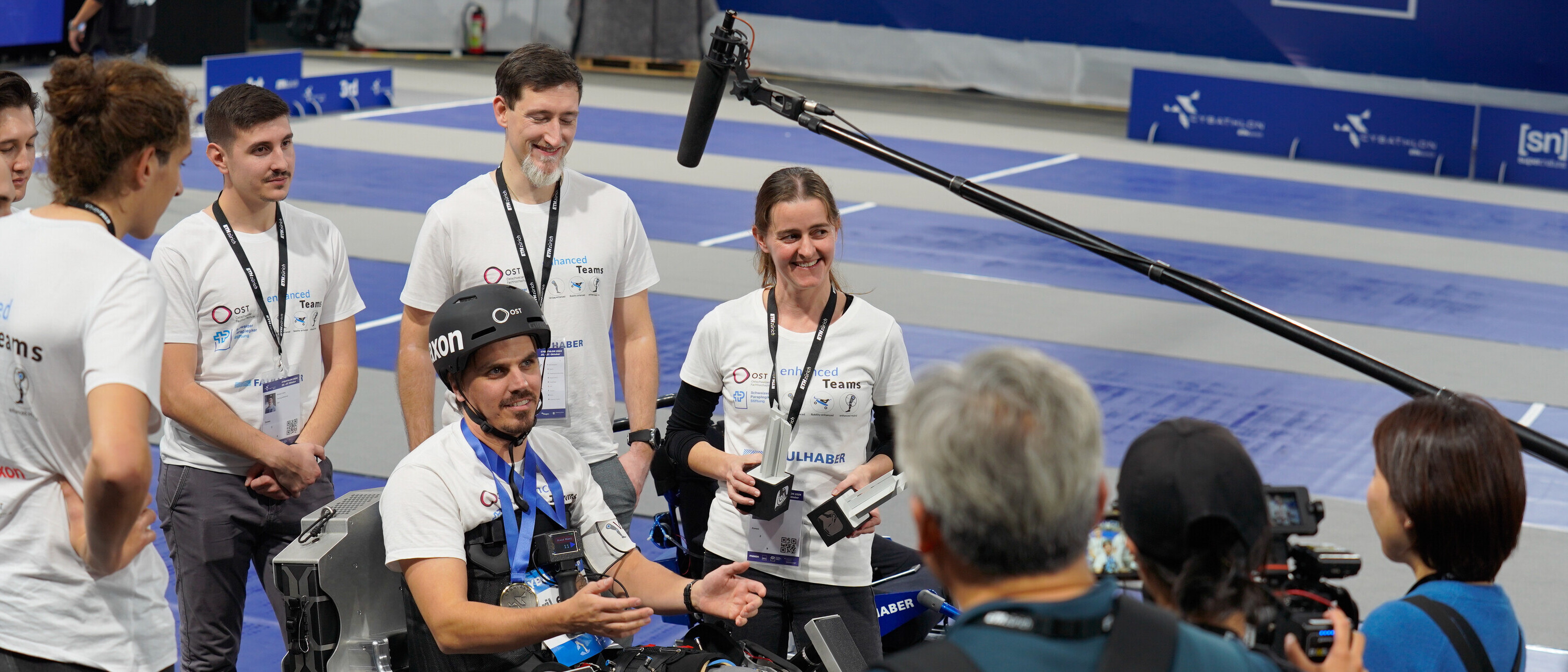 Expectations were high after winning wheelchair gold medals in 2016 and 2020, and the fans of the two OST teams were not disappointed. In the wheelchair finals, Schoch secured the silver medal with a personal best. Shortly afterward, he repeated this achievement with the exoskeleton. Schoch is the only pilot to have won two medals and trophies in a single Cybathlon, which garnered international attention. Media teams from Taiwan, Japan, and the United Kingdom took the opportunity to interview the OST pilot.