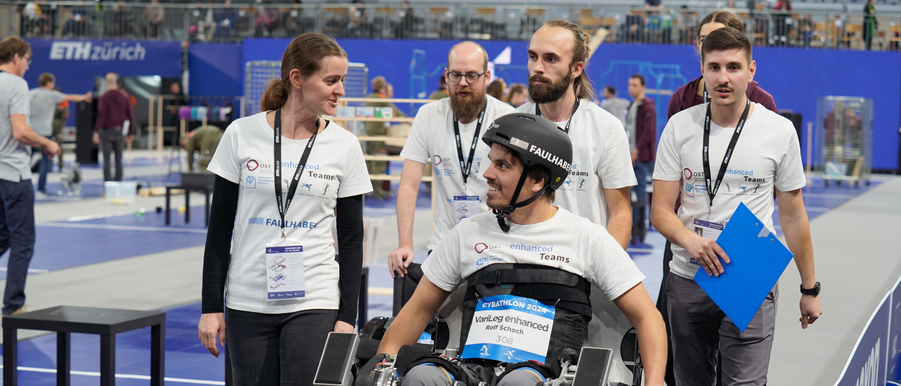 Preparation for the competition didn’t go smoothly. The day before the final Sunday, hybrid exoskeleton pilot Thomas Krieg had to withdraw due to health reasons. This left the two OST teams, Varileg enhanced and Robility enhanced, with only one active pilot—Rolf Schoch. Although Schoch had only trained with the robotic wheelchair under competition conditions this year, he had already piloted the exoskeleton’s previous version at the 2020 Cybathlon.