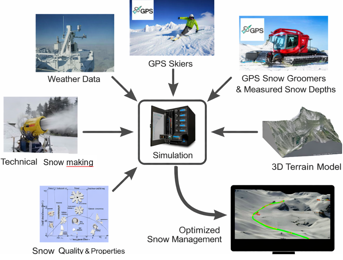 In this project, a simulation model is developed that consolidates data from multiple sources. Based on frequently used sections of ski slopes, weather conditions, and additional data, the difference between target (planned) and predicted actual snow depth is used to calculate how much snow is required on specific sections of the slopes.