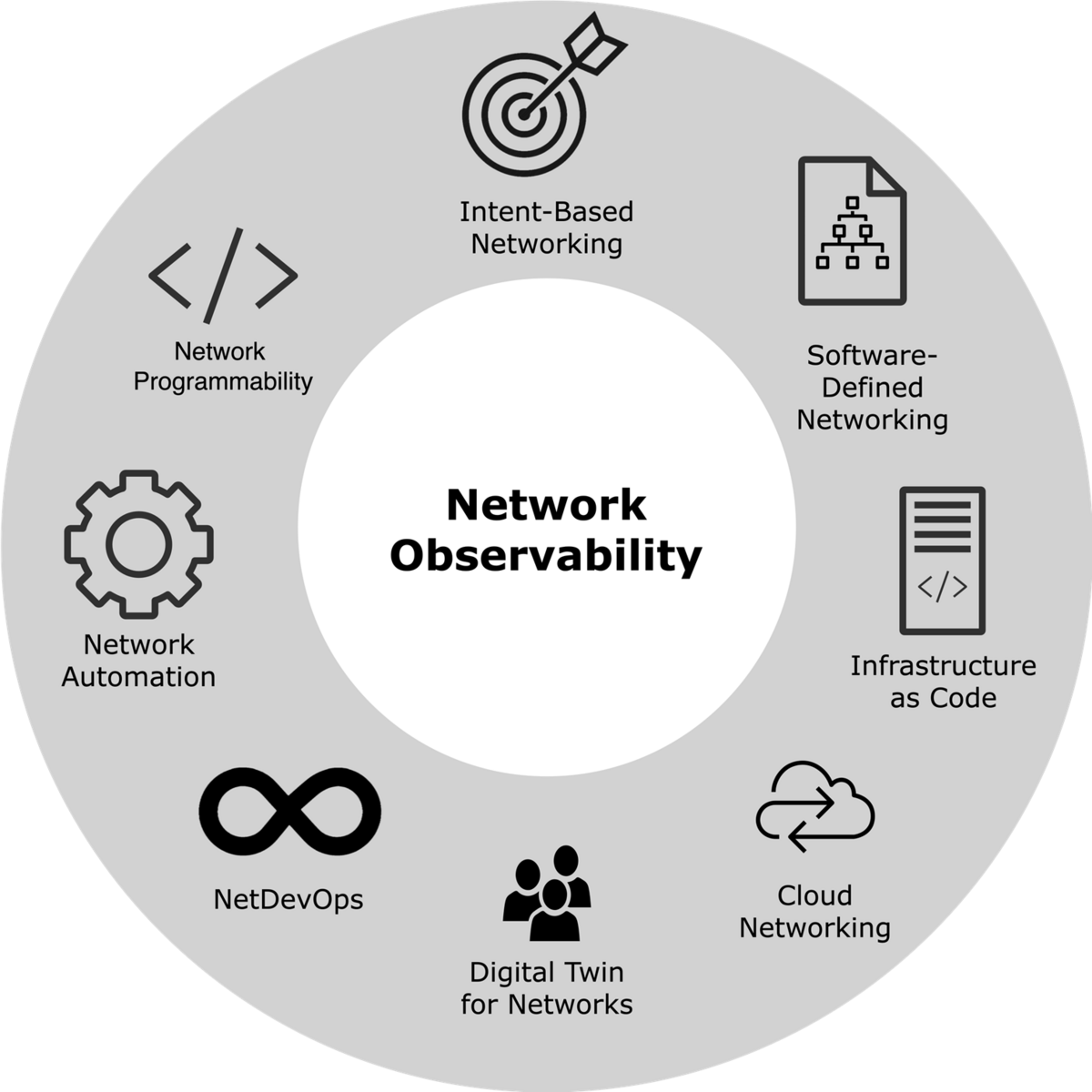 This graphic illustrates the central themes of our research area in the context of modern network technologies. At the core is Network Observability — comprehensive visibility and analysis of network states. To achieve this goal, we focus on key technologies such as Intent-Based Networking, Software-Defined Networking, Infrastructure as Code, Cloud Networking, Digital Twins, NetDevOps, Network Automation, and Network Programmability. These components form the foundation for future-proof, automated, and more resilient network infrastructures.